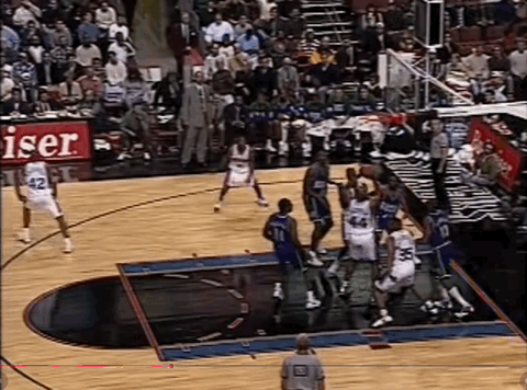 当时联盟的进攻风格与现在天差地别——那仍属于内线的末法时期,比赛节奏普遍缓慢而沉闷,进攻大多要围绕大个子球员展开。1990年选秀的状元秀德里克-科尔曼是76人半场进攻的核心,只要他在场,球队就会尽量将球交到低位由他发起。而斯塔克豪斯作为球队上个赛季的头号得分手,同样需要在侧翼和低位获得进攻机会。贵为状元,艾弗森也不得不先学会给老大哥们“打下手”,常常需要等待队友落位,再伺机传球。