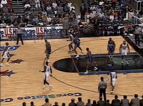 然而,当比赛进入攻防转换,赛场对艾弗森而言便豁然开朗。这是他最能展现运动天赋的舞台:上半场他砍下11分4助攻,大部分的进球都来自快攻,包括一记技惊四座的一条龙劈扣。