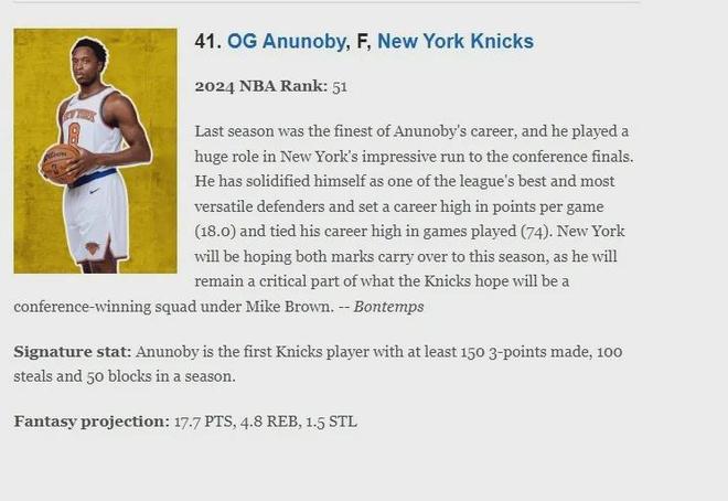 在赛季初ESPN公布的NBA2025-26百大球星中,OG排名第41,在尼克斯队内排名第3,布伦森第10,唐斯第27,可以看出他是尼克斯队三当家,网站评语如下: