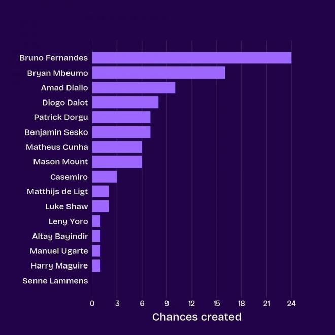 数据机构squakwa统计了本赛季曼联队内英超创造机会情况,B费仍独自领跑。